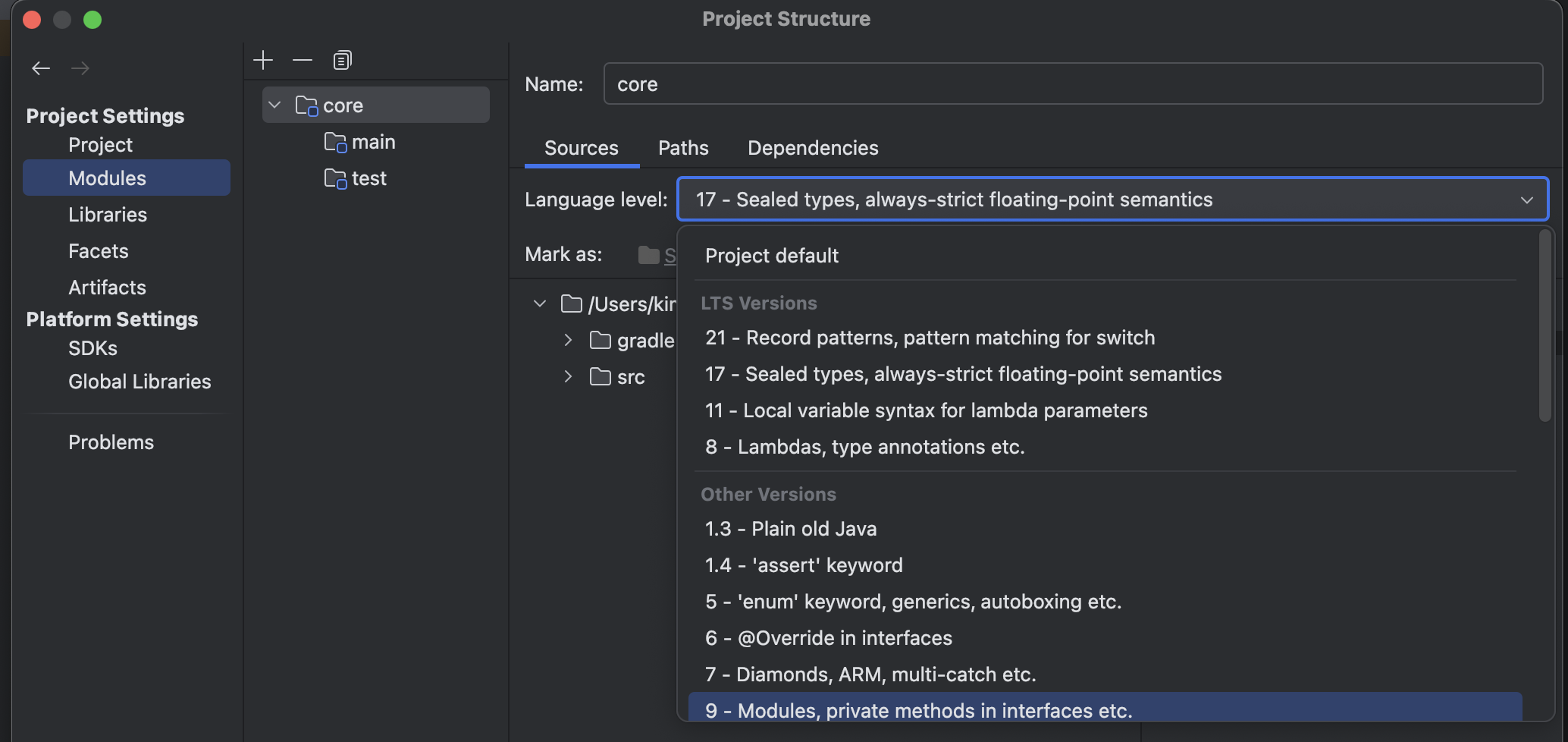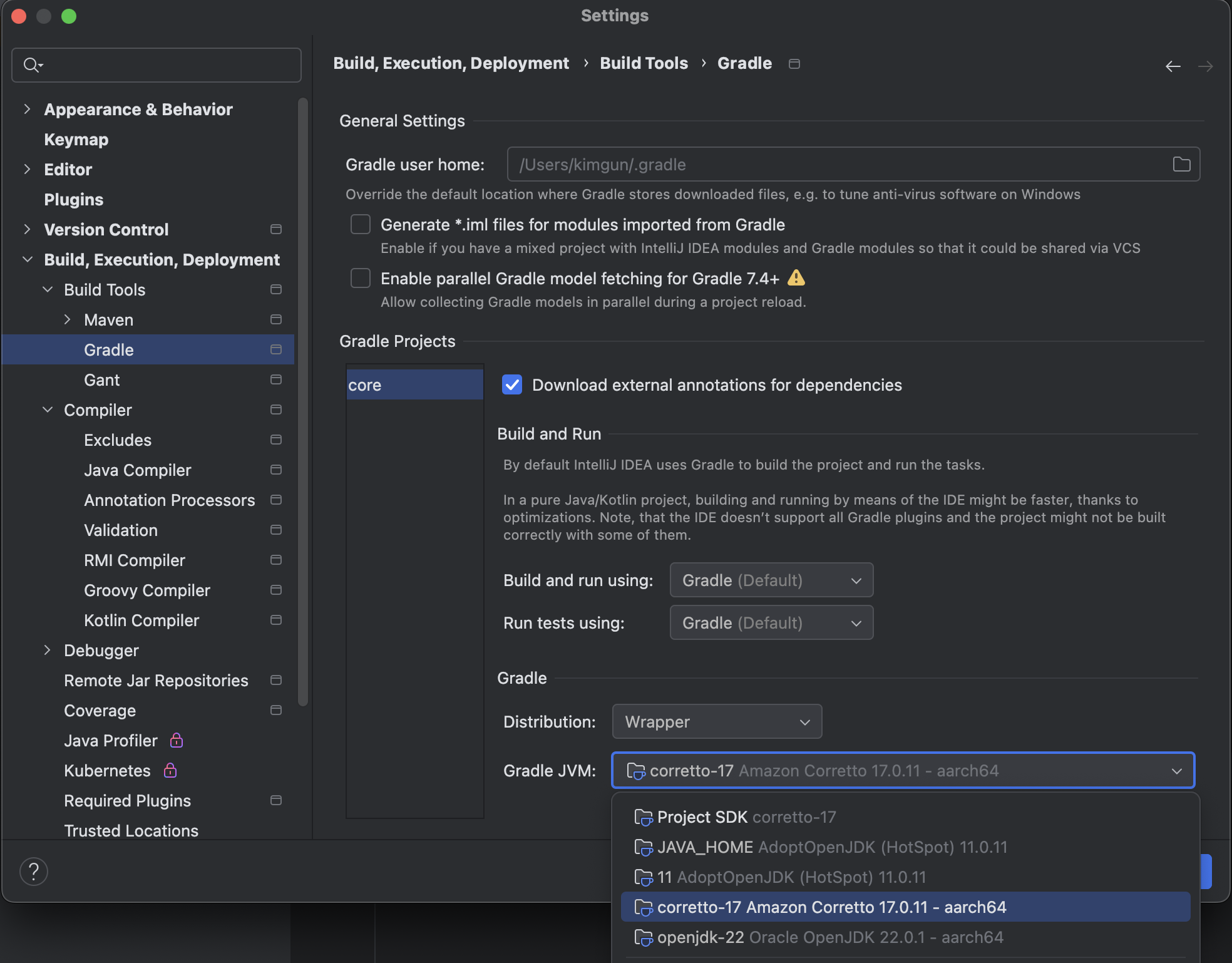 이클립스가 JAVA_HOME 경로로 자바 jdk를 불러오기 때문에, IntelliJ를 실행한 후 별도의 jdk를 다운로드하고 총 네 곳에서 JDK를 변경해주면 된다.